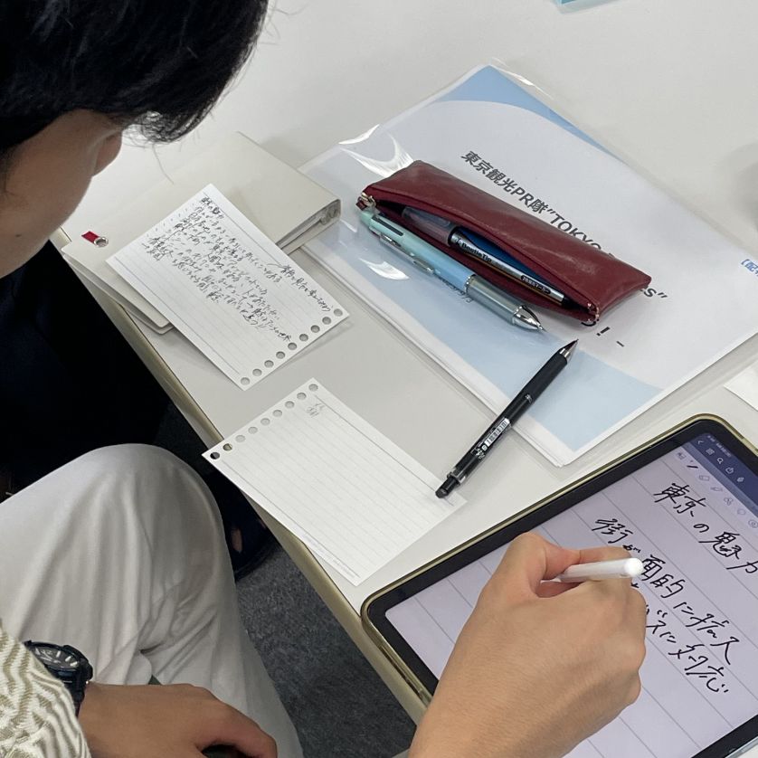 1日目は、PRを専門とする講師をお呼びし、そもそもPRとは何かをレクチャーいただきました。その後、ワークシートを使いながら、海外の方の興味関心と、自分の感じる東京の魅力をどうマッチングすればいいのかを全員で議論し考えました。何を投稿するかといったテーマアイデアが出てきたら、次にどのようにコンテンツに仕立てていくかといった制作の流れも教わりました。