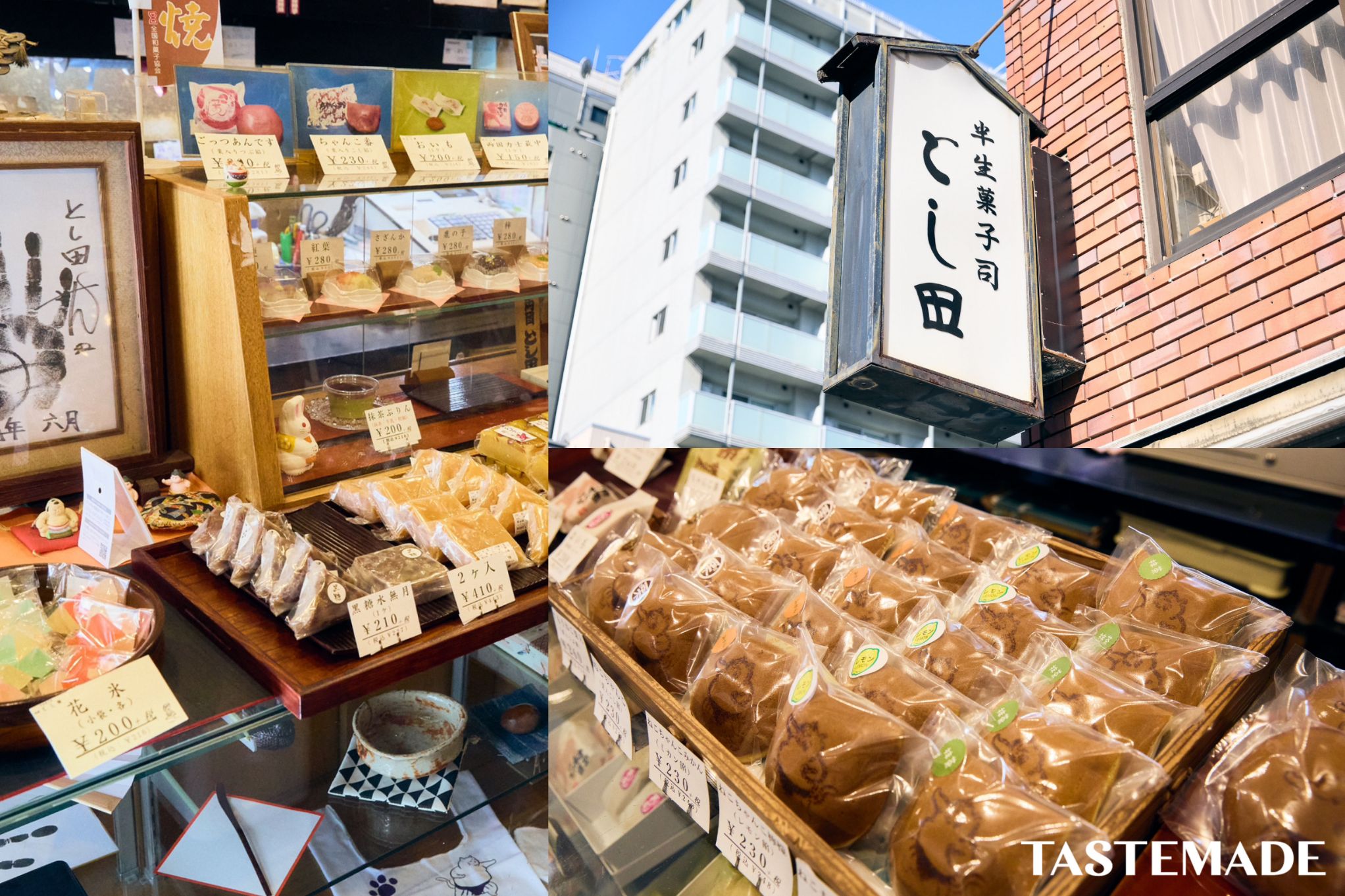 そんな町並みを楽しみながら歩くこと3分ほどで見えてくるのが、1921(大正10)年に干菓子専門店として創業した和菓子店「とし田」。こじんまりとした店内に入ると、所狭しとお菓子が並んでいます。
