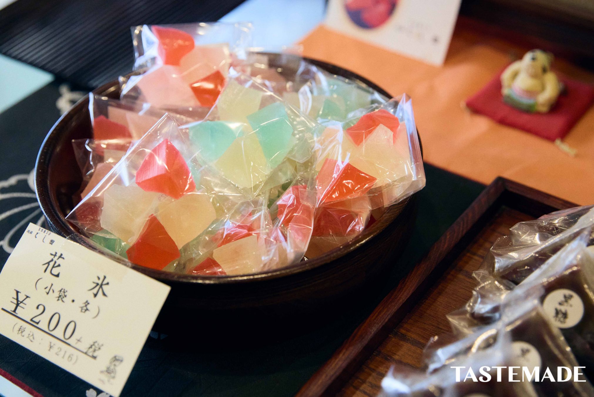 見た目も鮮やかな「花氷」は、創業以来つくられている干菓子。寒天と砂糖を固めたものをカットして乾燥させており、外側はカリッと中はふんわりとした食感が特徴です。