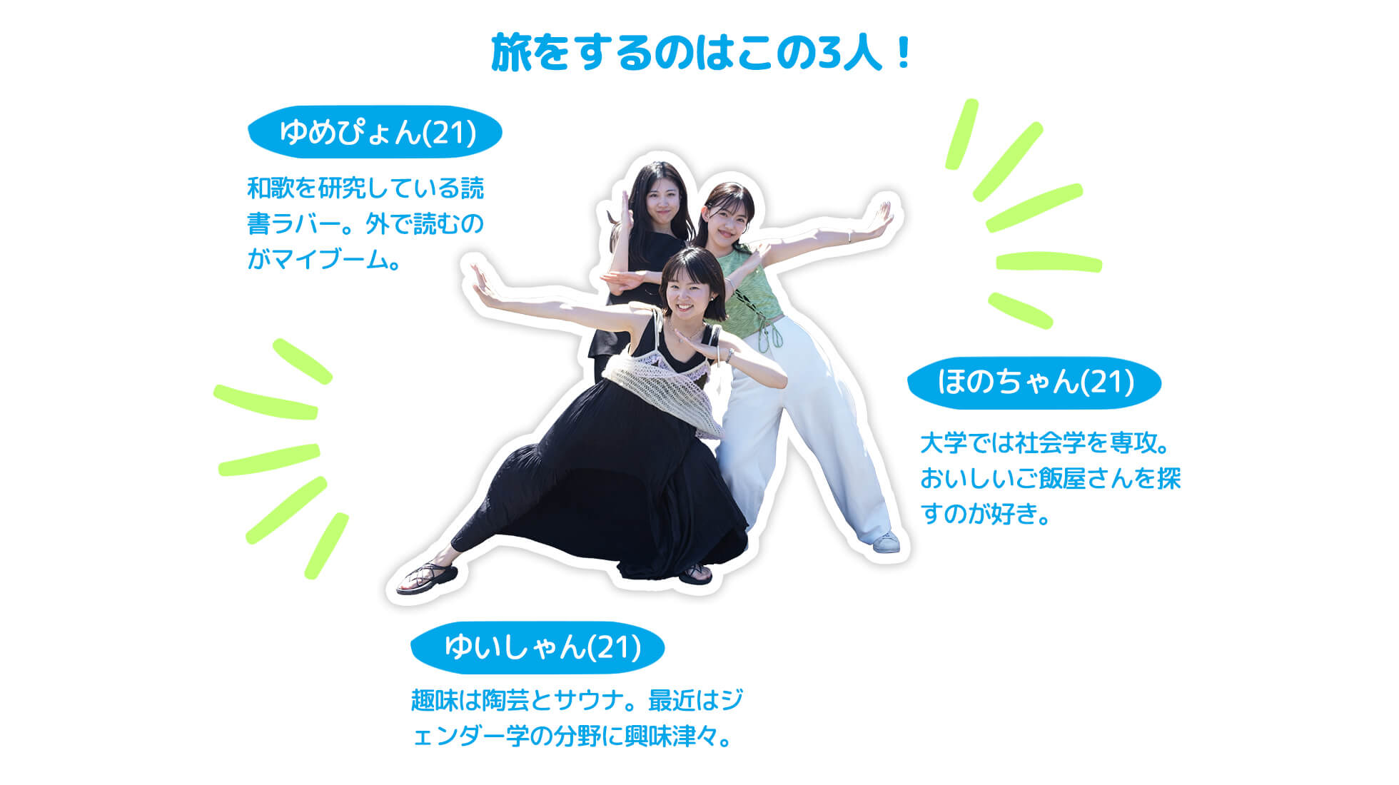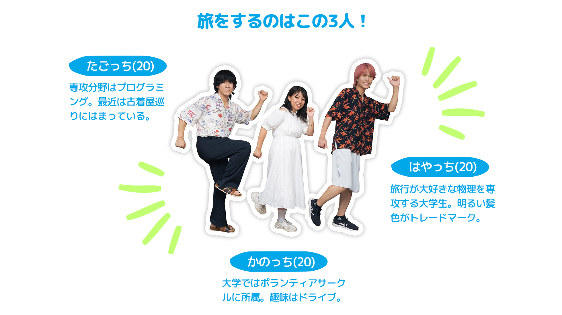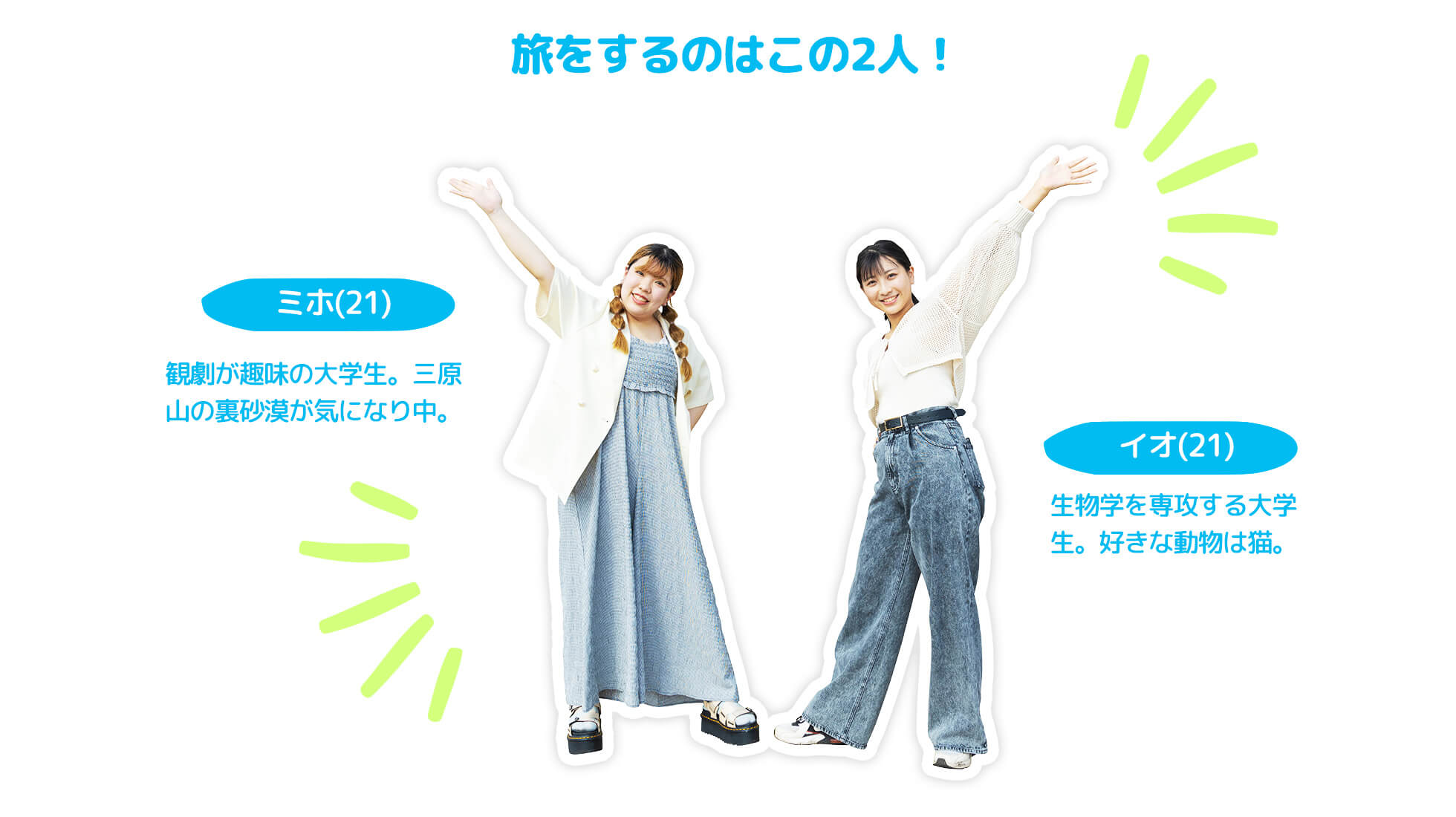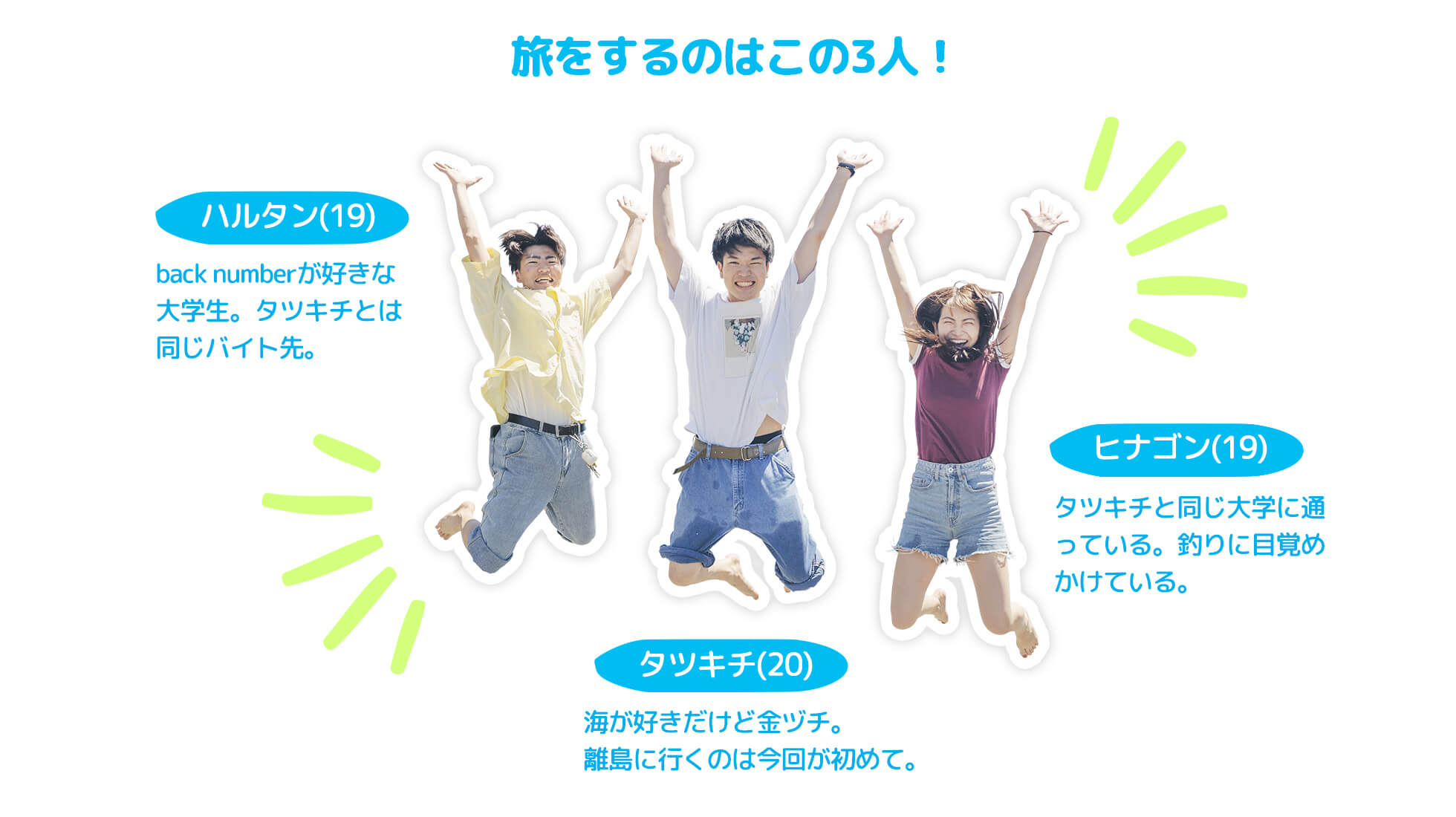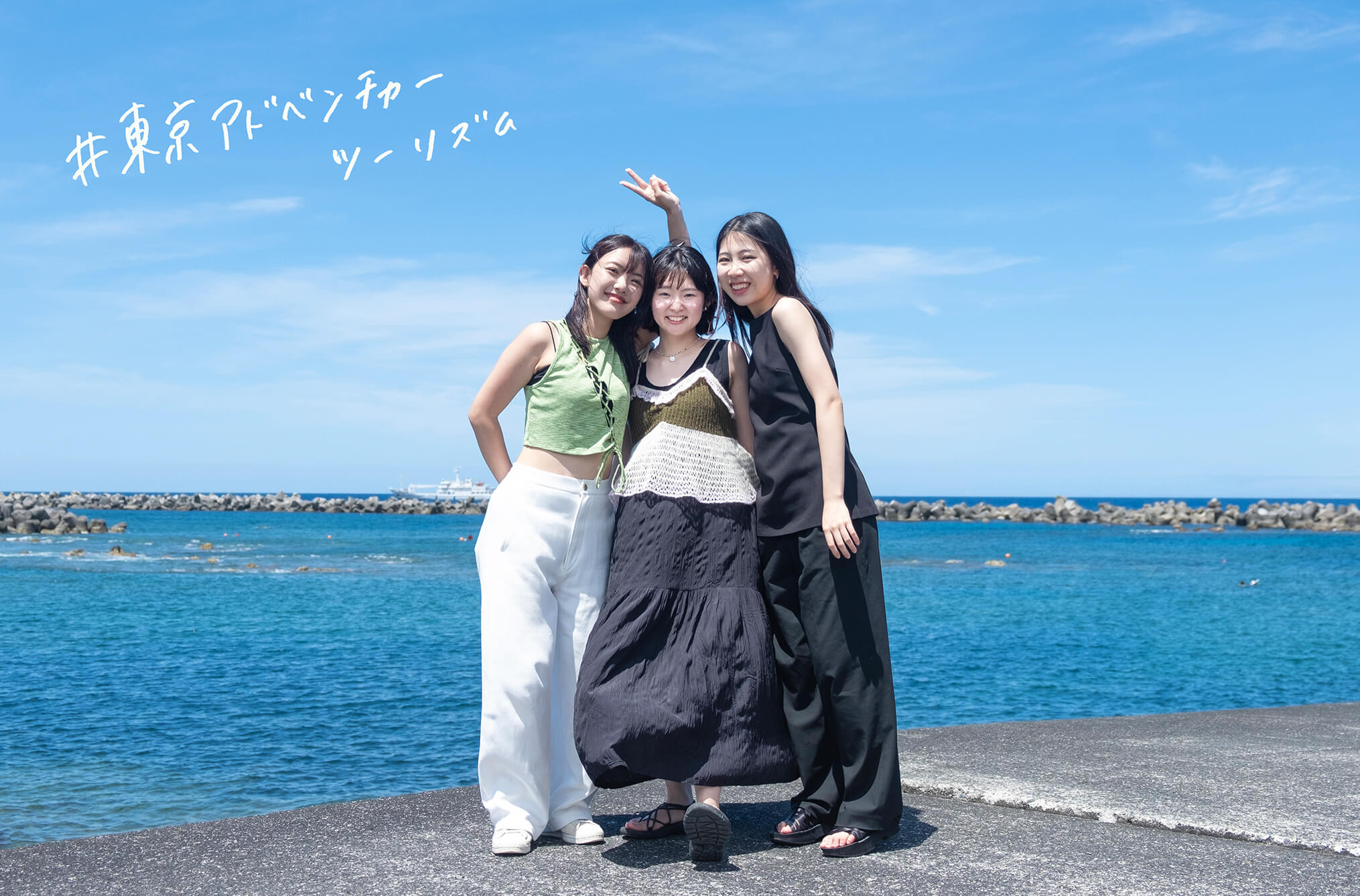 原宿の洋服屋さんでアルバイトをする仲良し3人組が行くのは、羽田空港から飛行機で約55分の離島、八丈島。空港を出るとまず目に飛び込んでくる、青い空と大きなヤシの木。南国気分を盛り上げる美しい景色に大興奮の3人は、早速記念写真をパシャリ! 潮風香るリゾートアイランドで、ダイビングに挑戦したり島ならではの作物について学んだり…。五感で楽しむとっておきの島旅、スタートです。