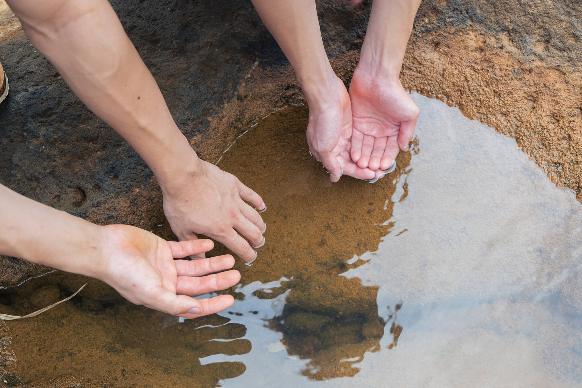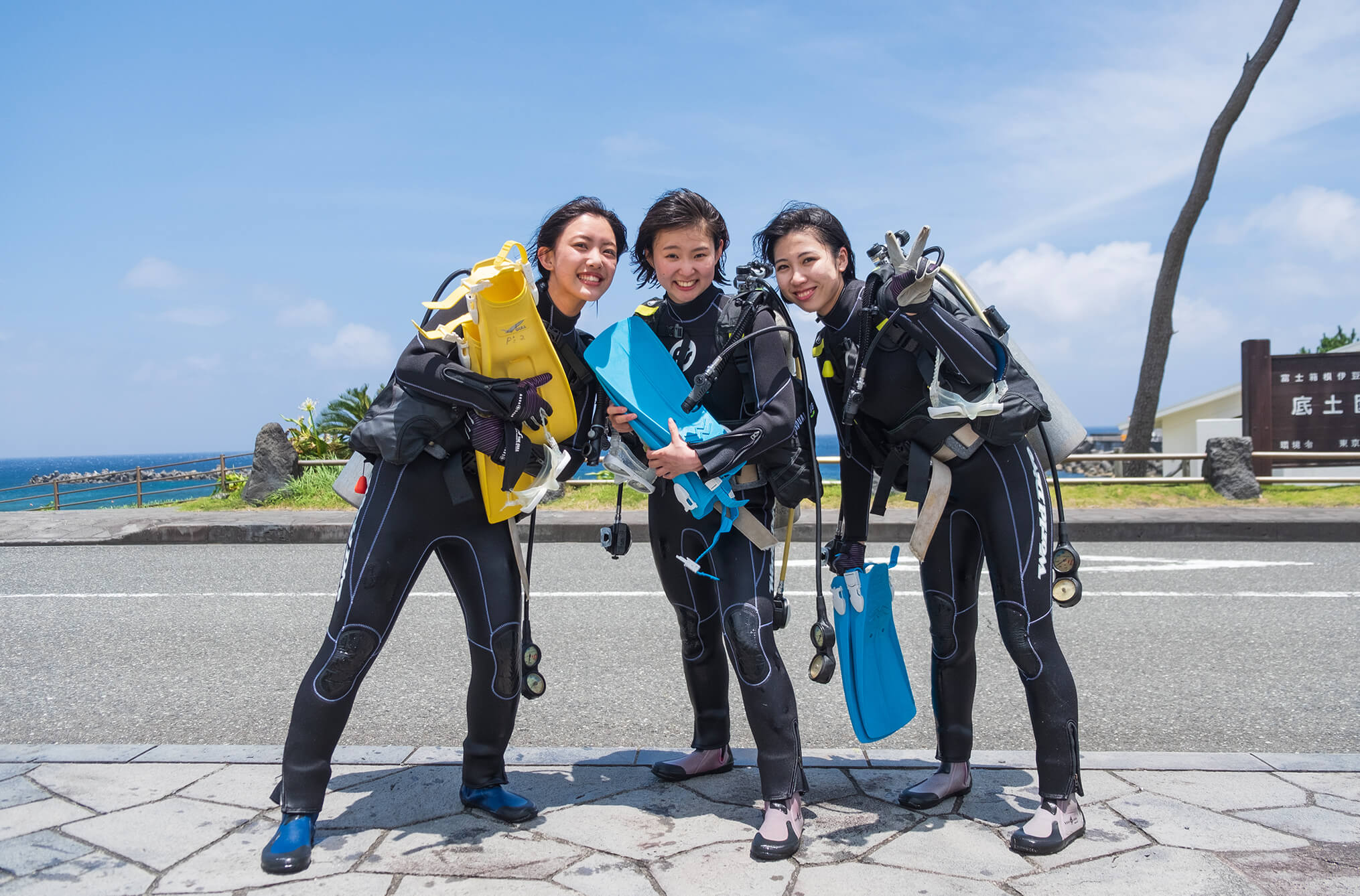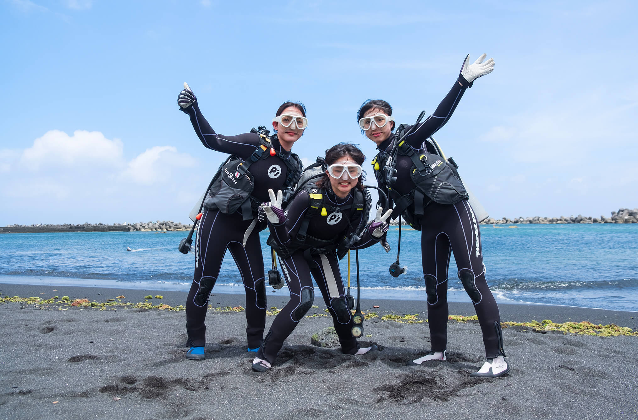 最初に3人が挑戦するのは、海を探検する体験ダイビング。八丈島の海は年間の平均透明度が非常に高く、八丈ブルーと呼ばれる美しい青さが特徴です。溶岩が作り出したアーチやトンネルなど、ユニークな地形には海の生き物がたくさん! 島には多くのダイビングショップがあり、ライセンスを持たない初心者でも挑戦できるプランが充実。今回ガイドをお願いした「P’s club」では、ウェットスーツなどの機材レンタルが費用に含まれており、気軽にダイビングを体験することができます。