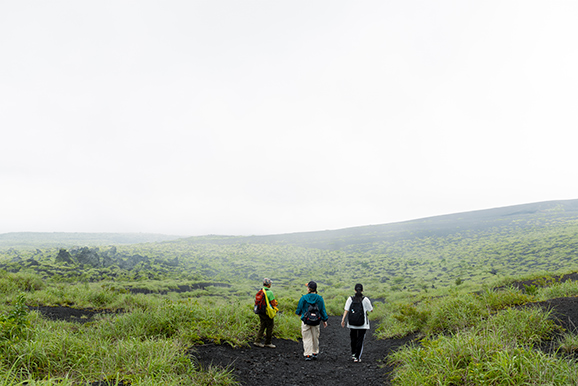 最初に3人が挑戦するのは、海を探検する体験ダイビング。八丈島の海は年間の平均透明度が非常に高く、八丈ブルーと呼ばれる美しい青さが特徴です。溶岩が作り出したアーチやトンネルなど、ユニークな地形には海の生き物がたくさん! 島には多くのダイビングショップがあり、ライセンスを持たない初心者でも挑戦できるプランが充実。今回ガイドをお願いした「P’s club」では、ウェットスーツなどの機材レンタルが費用に含まれており、気軽にダイビングを体験することができます。
